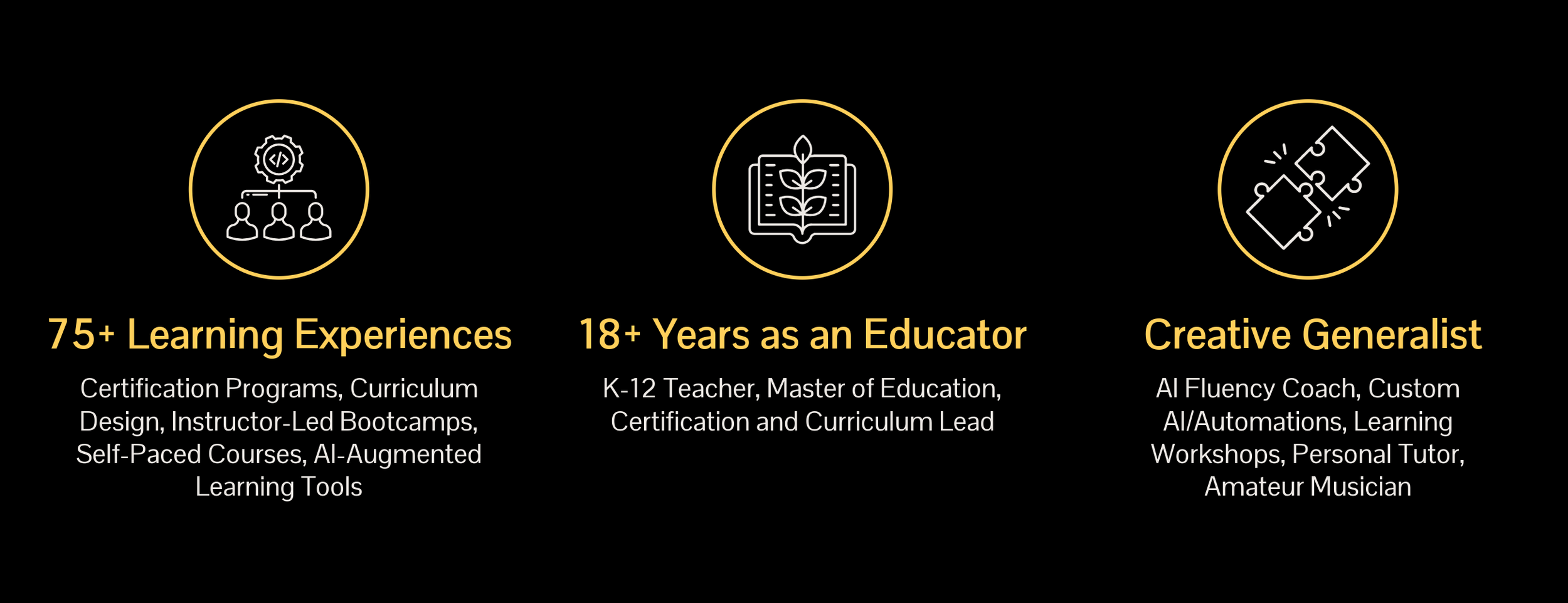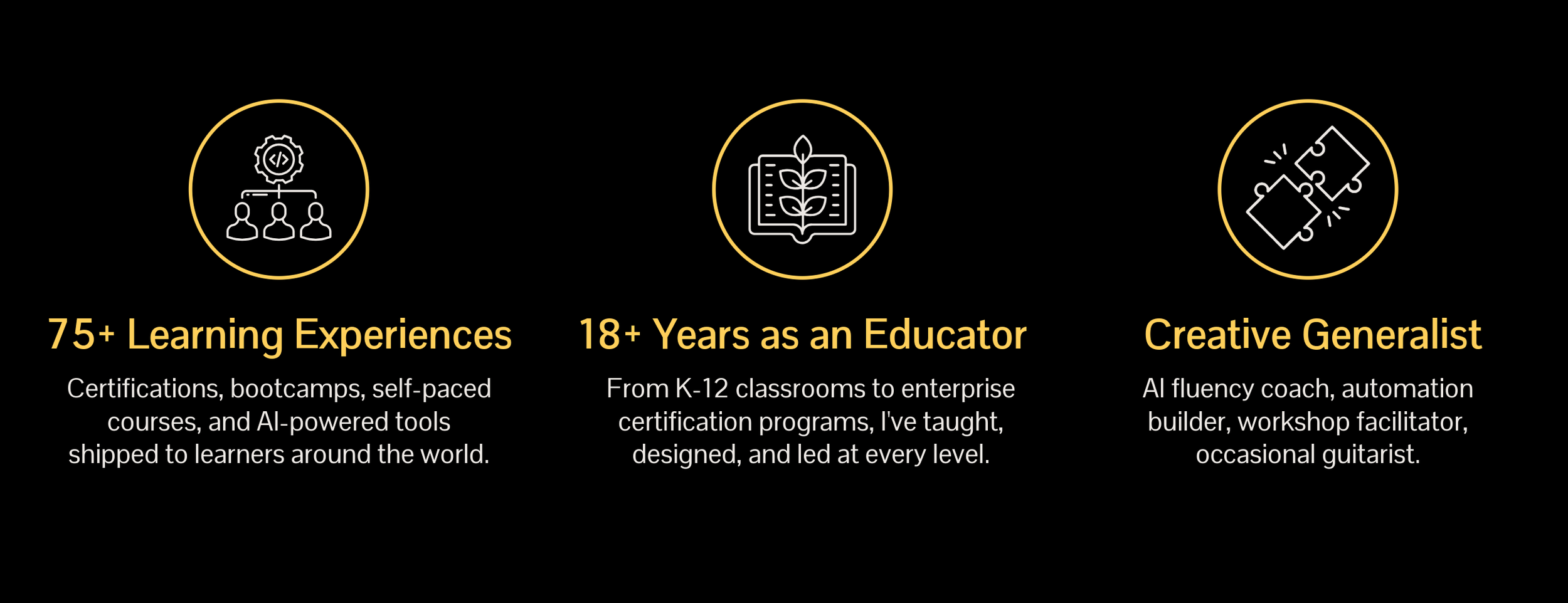 The best learning doesn't feel like learning. It feels like a story worth finishing. I bring together narrative design, creative craft, and deep subject matter expertise to turn complex content into something people actually want to move through. Whether it's a custom workshop, a certification program, or a full curriculum build, the goal is always the same: make it memorable enough to matter.